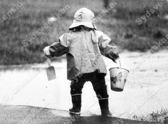 Lekande barn Regn sydväst regnkappa spann spade Människor Barn Lekande Utomhus Naturfenomen Regn Mode Regnkläder 1974