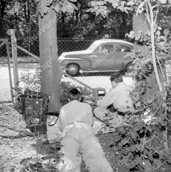 Polisen har hastighetskontroll vid Limhamnsvägen i Malmö Poliser med mätapparater och kommunikationsradio Trafik Kontroller Trafikövervakning Hastighet Fartkontroll 1955 Polis trafikpolis Motor personbilar Volvo PV 444