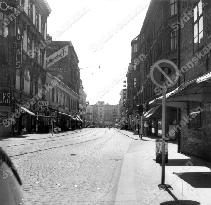 Södergatan en söndag morgon med stillsam trafik 1955 – sett från korsningen Skomakaregatan Baltzarsgatan mot Trygg