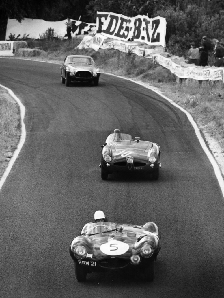Full fart på nytt efter kurvan vid skolhuset under storloppet. Främst Head på Jaguar, sedan Kvarnström på Disco Volante.