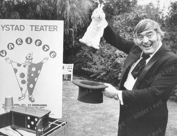 Ulf Mörling redaktionschef Sydsvenskan Chefredaktör Kvällsposten Illusionist Trollkarl Trollar fram en kanin ur sin hatt 1977 Variete Ystad