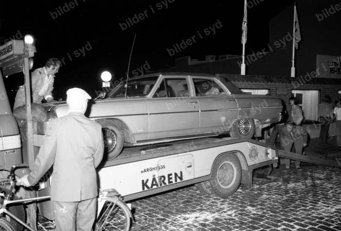 Slagsmål mellan raggare från Malmö och Ystad Stort polisuppbåd i centrala Ystad Människor Ungdomar Raggare 1975 Raggarbråk Bärgningskåren bärgar en bil som blivit skadad