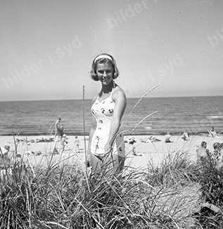 Tennisveckan Båstad juli 1959 Reportage för Veckojournalen om kändisar och celebriteter som njuter av livet i Båstad och Arild Karin Schmidt i baddräkt med körsbär gift med Ulf Schmidt tennis