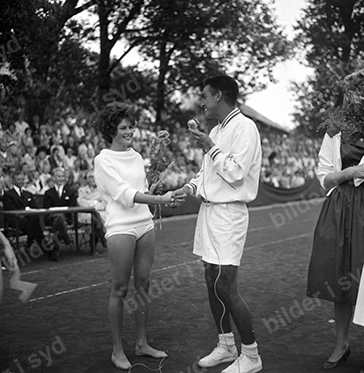 Tennisveckan Båstad juli 1959 Snurrefesten Tennisstadion Uttagning miss Båstad Alex Olmedo tennis Peru delar ut pris till en av deltagarna