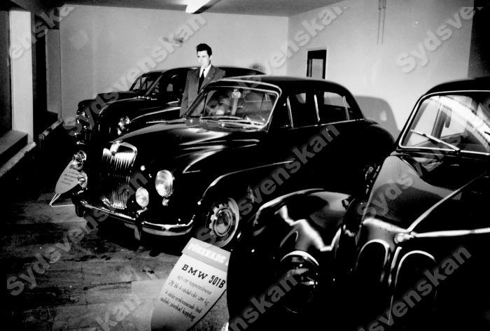 Förenade bil Invigning av nya filialen på Storgatan 30 i Eslöv 1955 Olle Björnsson är chef för bilhallen Närmast kameran syns en BMW 501B