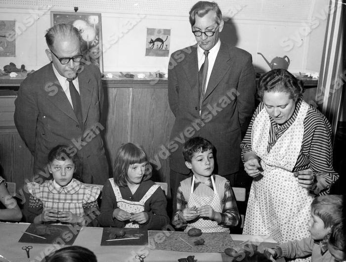 Mycket kul kan man göra med lera. De här andraklassarna går allvarligt in för uppgiften medan fröken Martha Carlsson visar och folkskoleinspektörerna Alvar Ahlner t v och K G Ljunghill tittar på