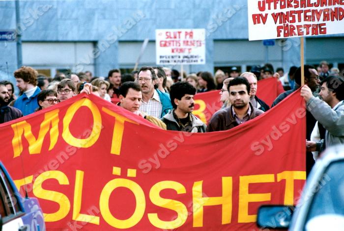 Arbetslösa demonstrerade tågade från Stadshuset till Drottningtorget i Malmö nov 1993.
