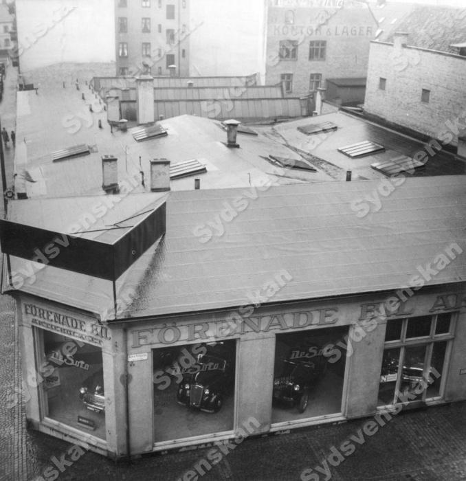 Bilfirman Förenade Bil AB i hörnet av Östra Tullgatan och Österportsgatan i Malmö 1949.