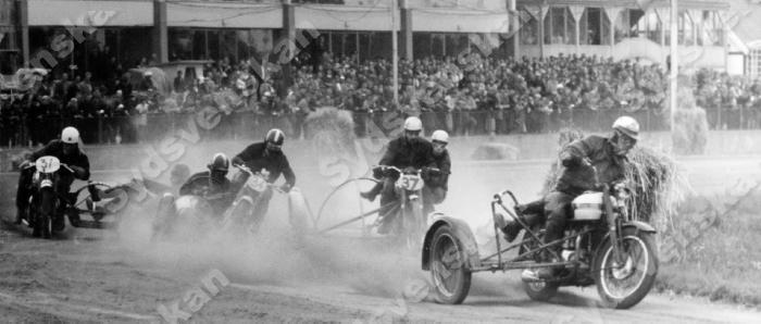 1956 Motortävling på Jägersro. Finalfältet i sidvagnsklassen har släppts iväg. Det är slutsegraren Egon Walter från Danmark drar fältet genom kurvan.
