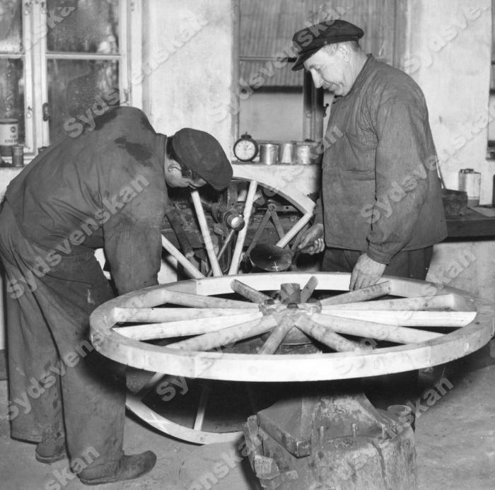 Smedmästare Otto Berglund och lärlingen Göte Hansson håller är på att måtta ett hjul till en gödselspridare i bysmedjan.
